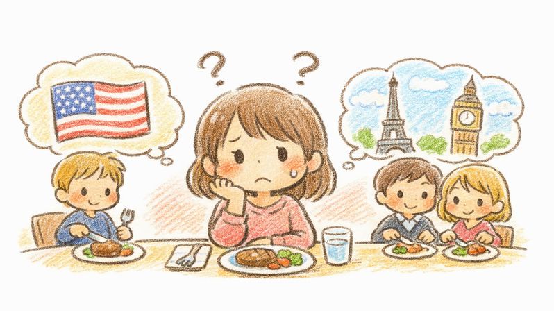 たとえば、アメリカ式は切るときにナイフを右手、フォークを左手で使って、切り分けたらナイフを置いてフォークを右手に持ち替えて食べるやり方がよく紹介されます。