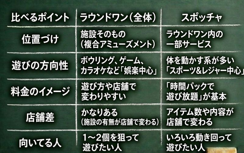 スポッチャとラウンドワンって、名前がセットで出てくるから「結局なにが違うの?」って迷いますよね。