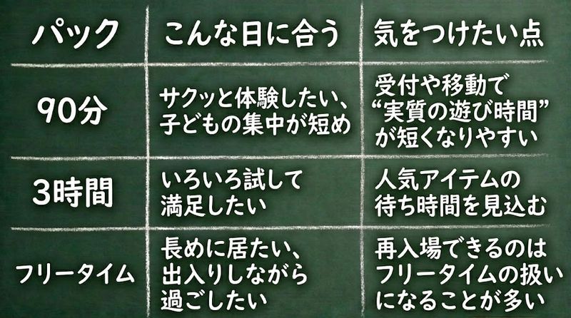 「初めてで様子見」なら90分か3時間、「今日はがっつり」ならフリータイム、みたいに決めると迷いが減りますね。