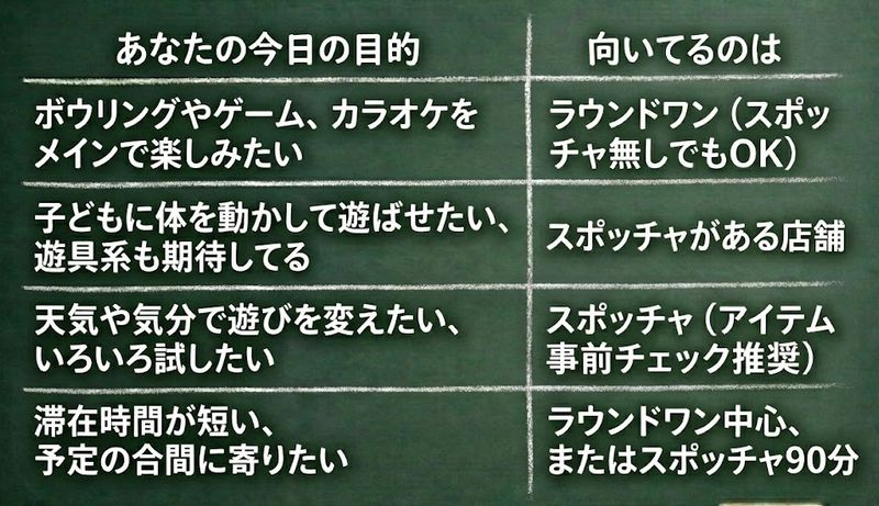 「スポッチャがあると思って行ったのに無かった…」がいちばんショックなので、ここは先回りが大事です。