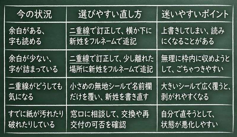 まとめ:基本は二重線で訂正して新姓を追記すれば安心しやすい。気になるなら窓口確認が早い