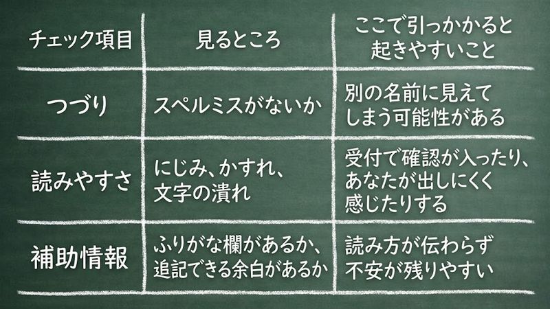 それから、にじみやかすれで読みにくい場合、つづりを間違えている場合は「本人の識別」に影響しやすいので、ここだけは丁寧に見直しておくと安心です。