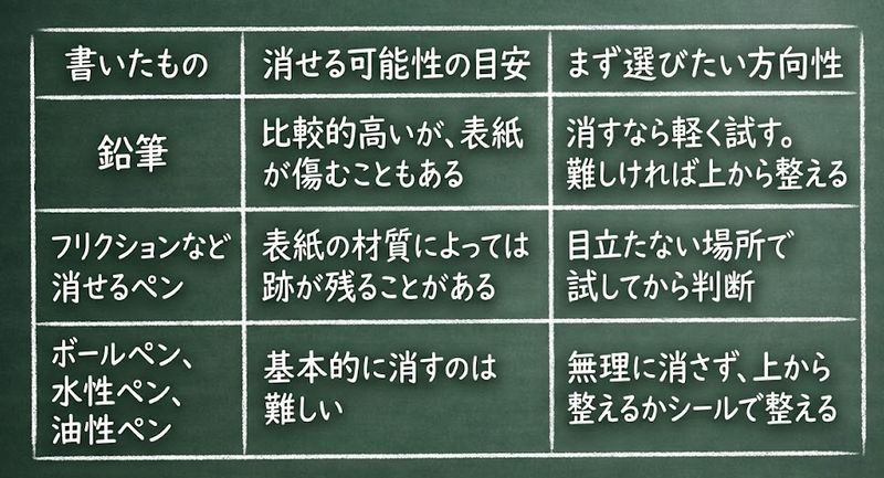 どうしても消したい場合は、鉛筆なら軽く試せることがありますが、ペン類は無理に消そうとせず、整える方向に寄せたほうがきれいに仕上がりやすいです。