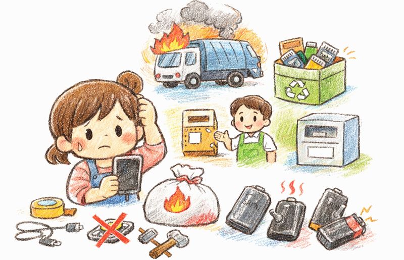出す前は端子をテープで覆って、分解したりつぶしたりせず、金属類と一緒にしないだけでも不安がかなり減りますよ。