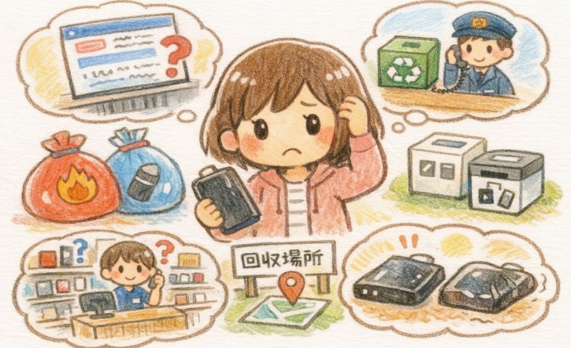迷ったら、自治体サイトでは「モバイルバッテリー」「充電式電池」「小型家電回収」の3語で探して、見つからなければ清掃担当に電話するのがいちばん早いですよ。
